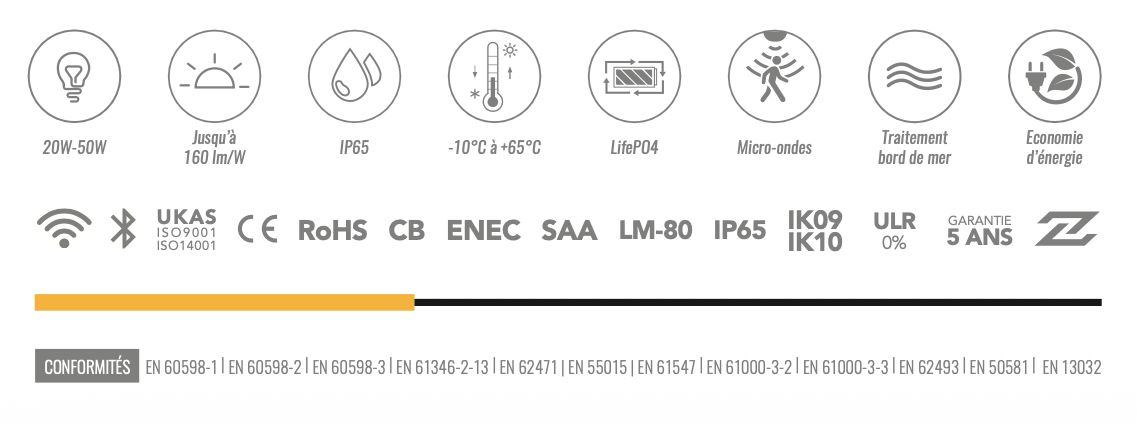 Luminaire solaire compact, idéal pour aires de stationnement, chemins piétonniers, environnements variés. Module LED avec angle incliné pour optimiser la diffusion lumineuse. Contrôleur solaire MPPT intégré, efficacité de charge jusqu’à 97 %. Batterie Lithium-fer-phosphate (LiFePO₄) de qualité supérieure. Capteur de mouvement intégré. Télécommande pour sélectionner différents modes de fonctionnement.